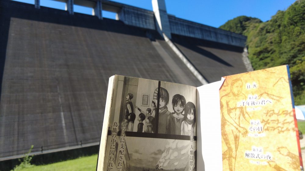 巨大な壁!漫画では高さ100mの壁。そして大山ダムのこの壁の高さもほぼ同じ94m。