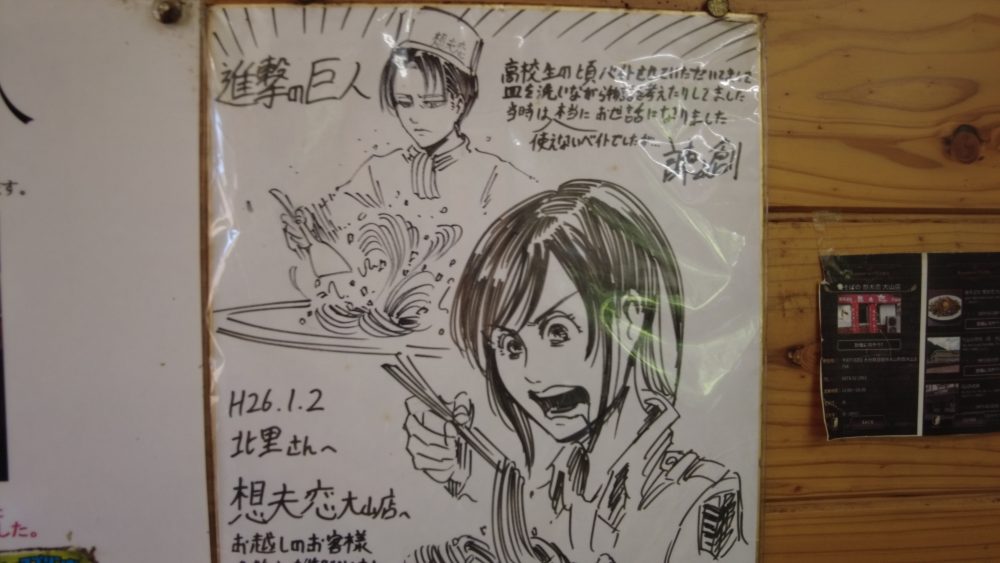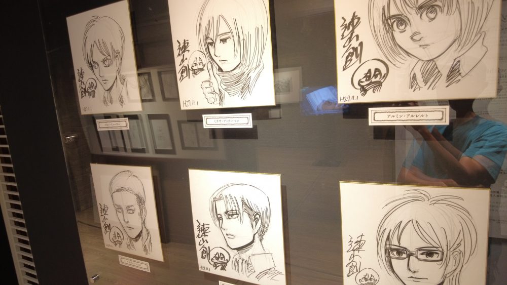 作者直筆のキャラクター達が並んでます。ココすごいのは撮影OK!写真も動画も撮れます!Youtubeやっている私じゃけん。後日進撃聖地巡りの動画をUP予定。