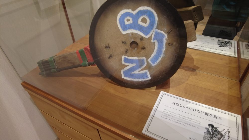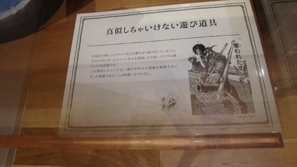 説明書きを読むと、どうやら作者は子供時代この手作り道具でロケット花火を打ち合う遊びを友人としていたらしく、この木製道具で花火を打ったり防御するのに使っていたそうです。そして!なんと!?これがアイデアの元で漫画に出てくる巨人に打ち込む武器の”雷槍”が生まれたそうです。