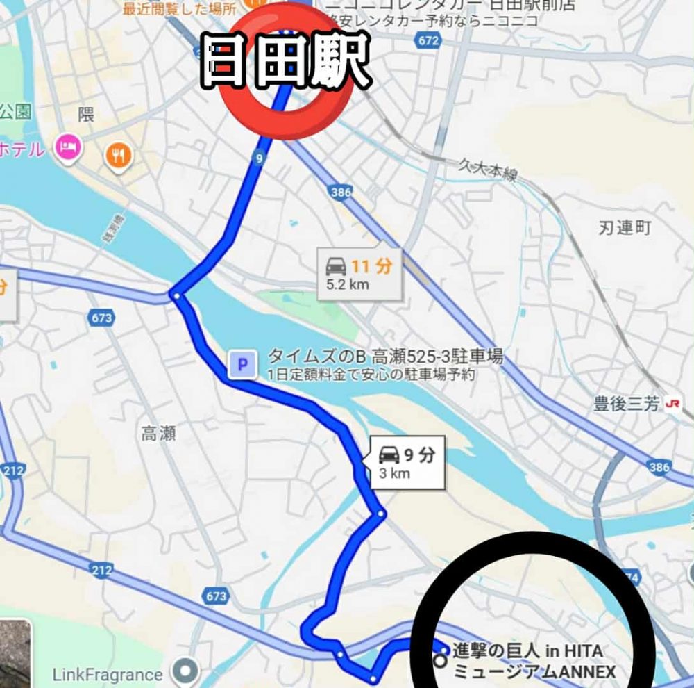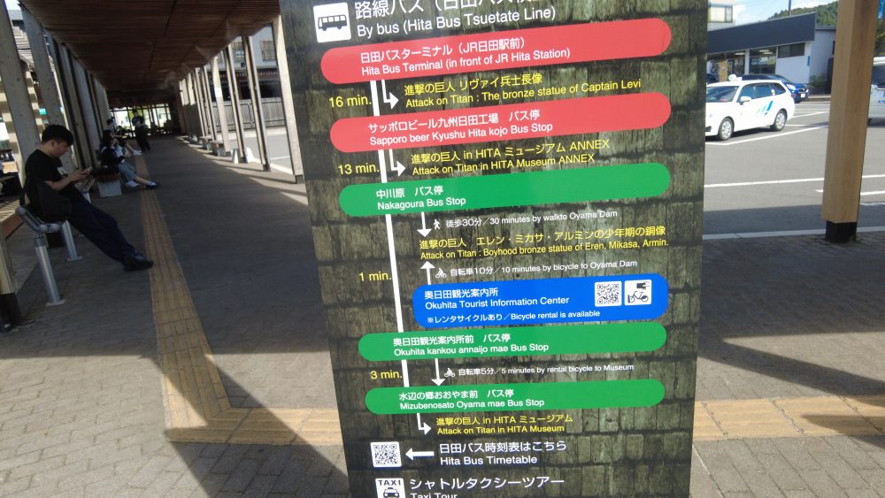 公共交通で今回の聖地巡りをする場合、日田駅から路線バス・タクシー利用してめぐる事も出来ます。