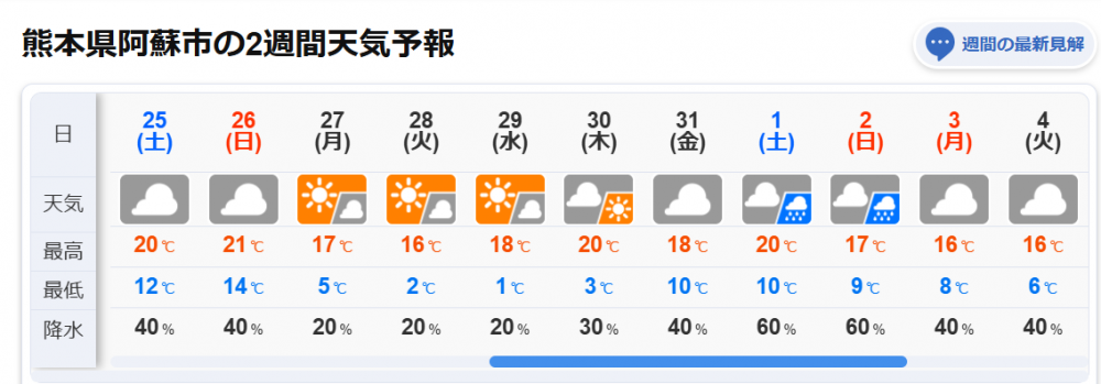 それは!最低気温にご注目ください。来週からいっきに冷え込み気温は一桁前半の予報。