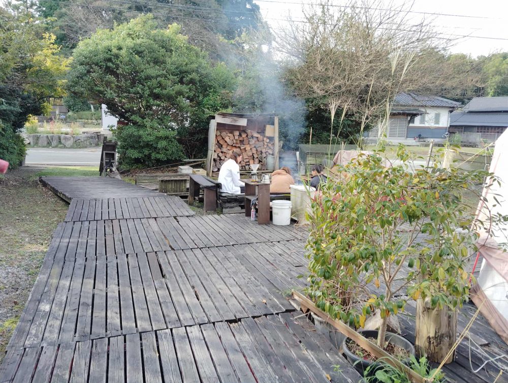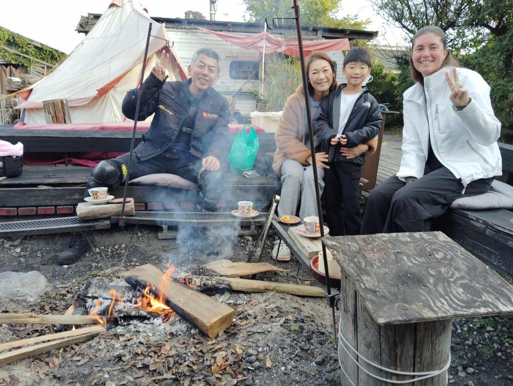 みなさん焚き火を選ばれます。この日は3連泊中の親子さん、2泊滞在してトレッキングを楽しむオーストラリアの女性、バイクで九州をめぐる男性。