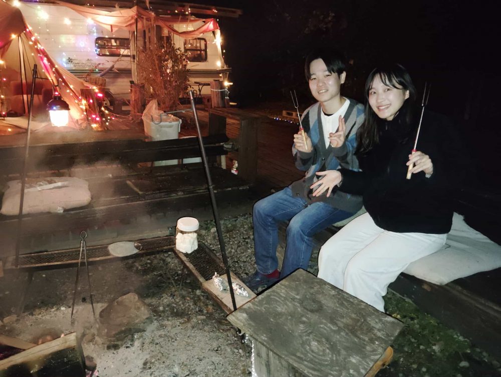 千葉よりお二人は受付の時に楽しめる抽選で見事!温泉招待GET!!焚き火で焼き芋&マシュマロ楽しんだ後の温泉&サウナは最高です!