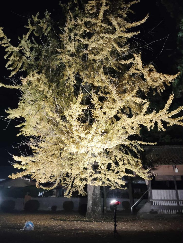 阿蘇び心の目にある神社、夜は大イチョウライトアップが神秘的。