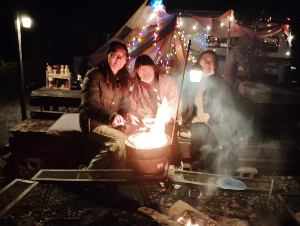 最近の朝の気温-5°。日が暮れると急激に気温さがりますが、そんな中でもゲストさん元気!焚き火+七輪BBQ楽しむ香港の女性3人。